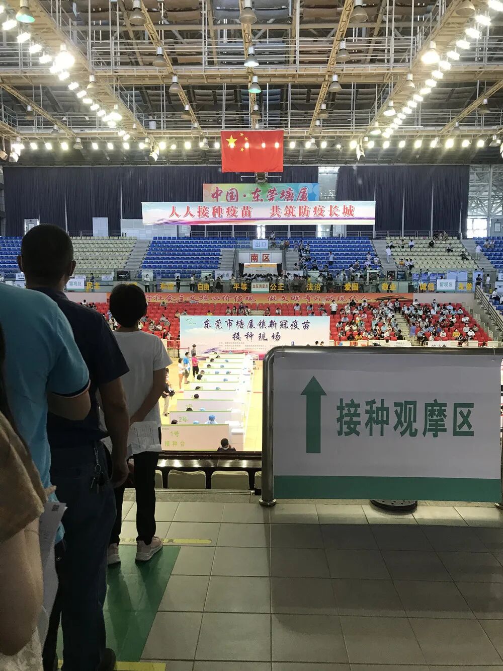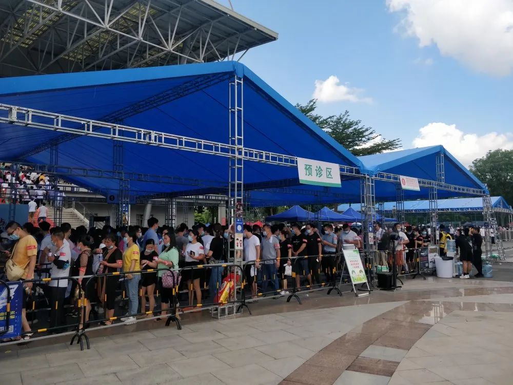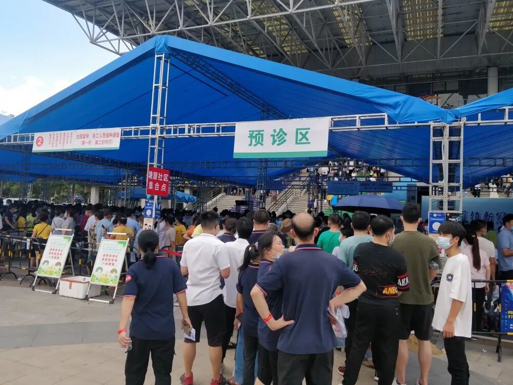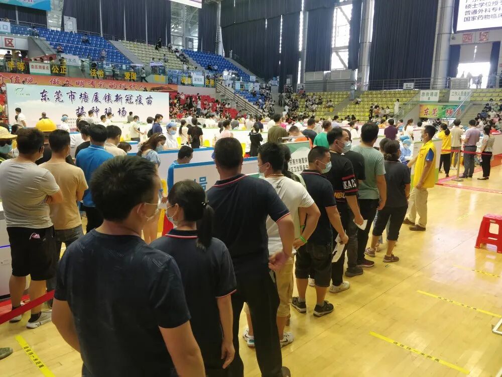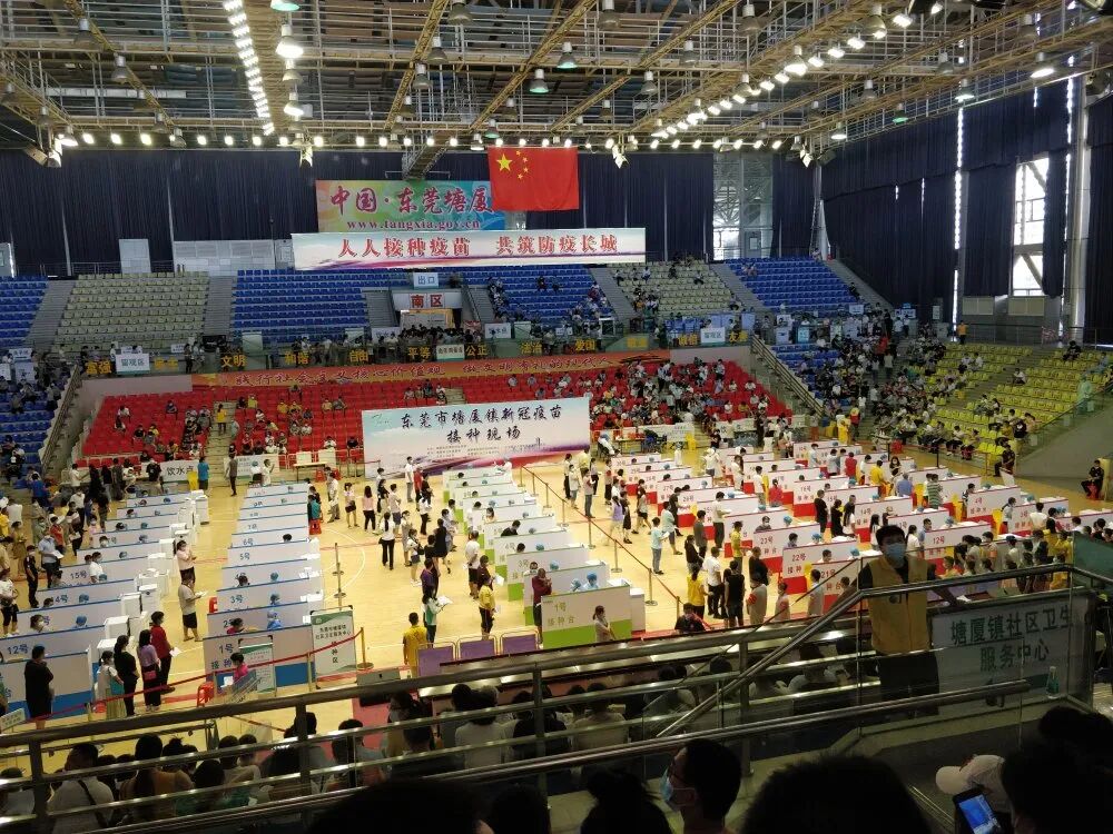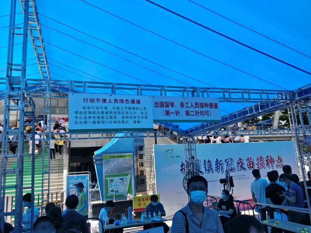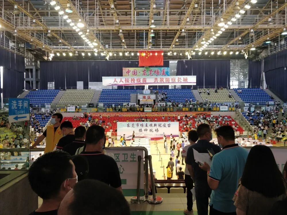 这是东莞首个大型临时接种点的场景。据说东莞卫生局给塘厦镇设定的目标是要在一天内完成1.5万人的疫苗接种。