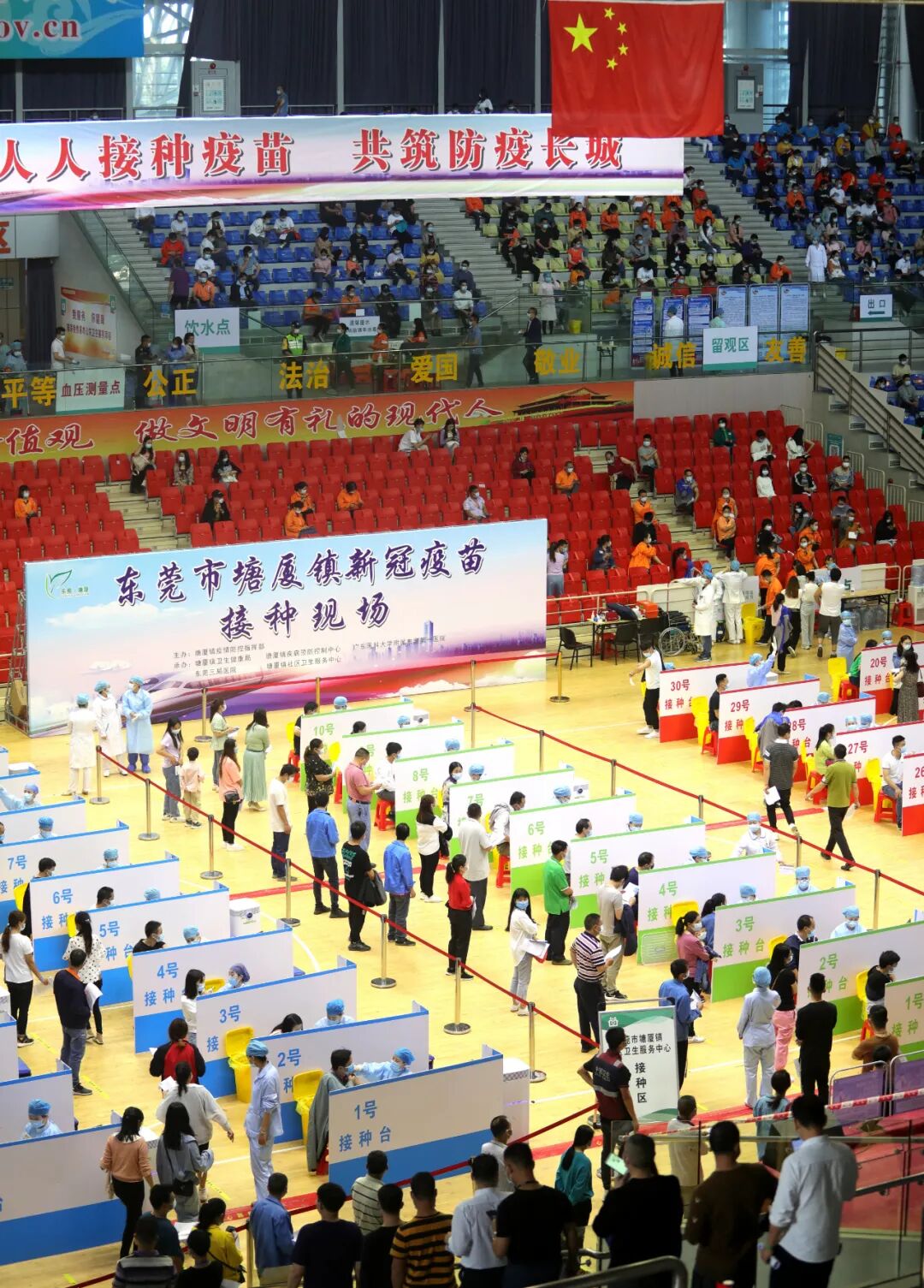 在塘厦体育馆内快速建设大型接种点。从制定工作方案、工作协调、医护及工作人员培训、信息录入员抽调,到场地布置、人员分工、院感防控、疫苗配送、接种人员报名,再到转运、后勤保障、安全保障等方面,塘厦镇都进行了细致的安排,确保每个环节不出差错。